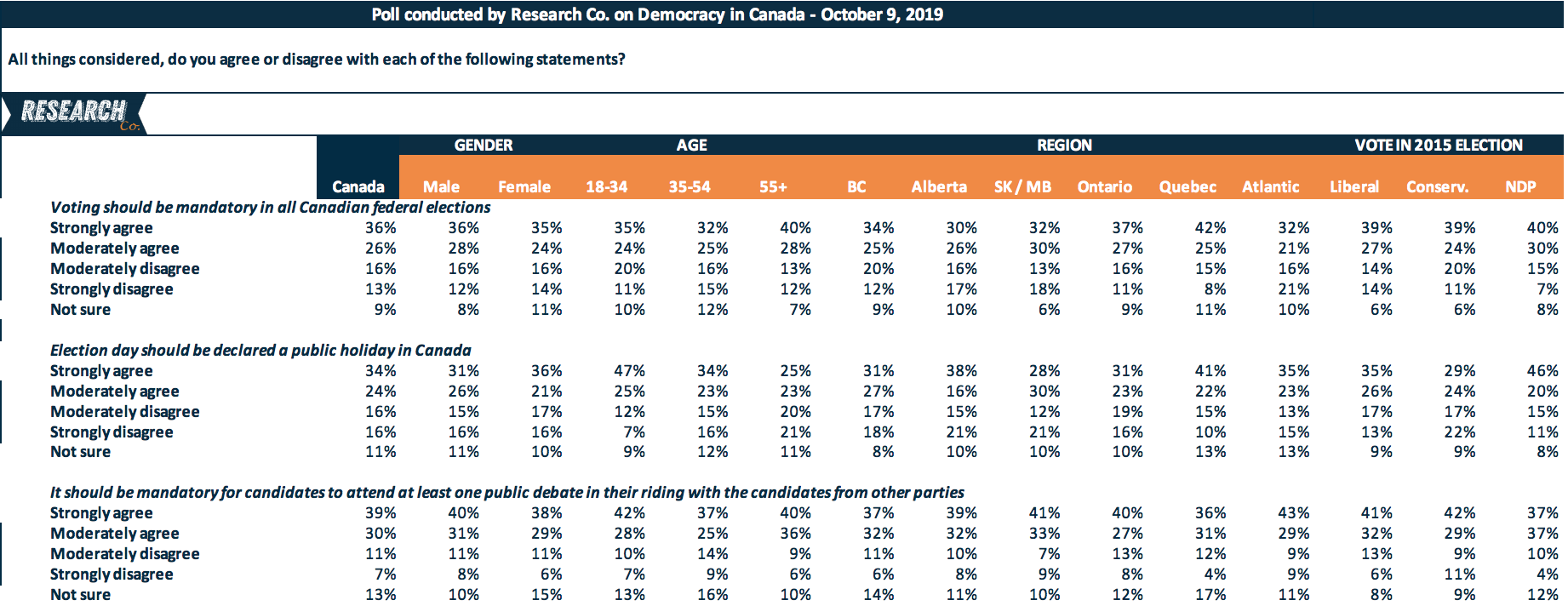 An even larger majority of respondents (69%) believe it should be mandatory for candidates to attend at least one public debate in their riding with the candidates from other parties.