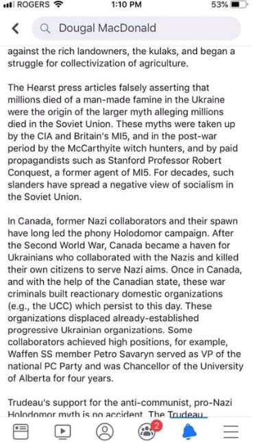 Dougal MacDonald, an Assistant Lecturer in the Faculty of Education at the University of Alberta, posted a message on Facebook on November 20th stating that the Holodomor is a “myth” and a “lie”.