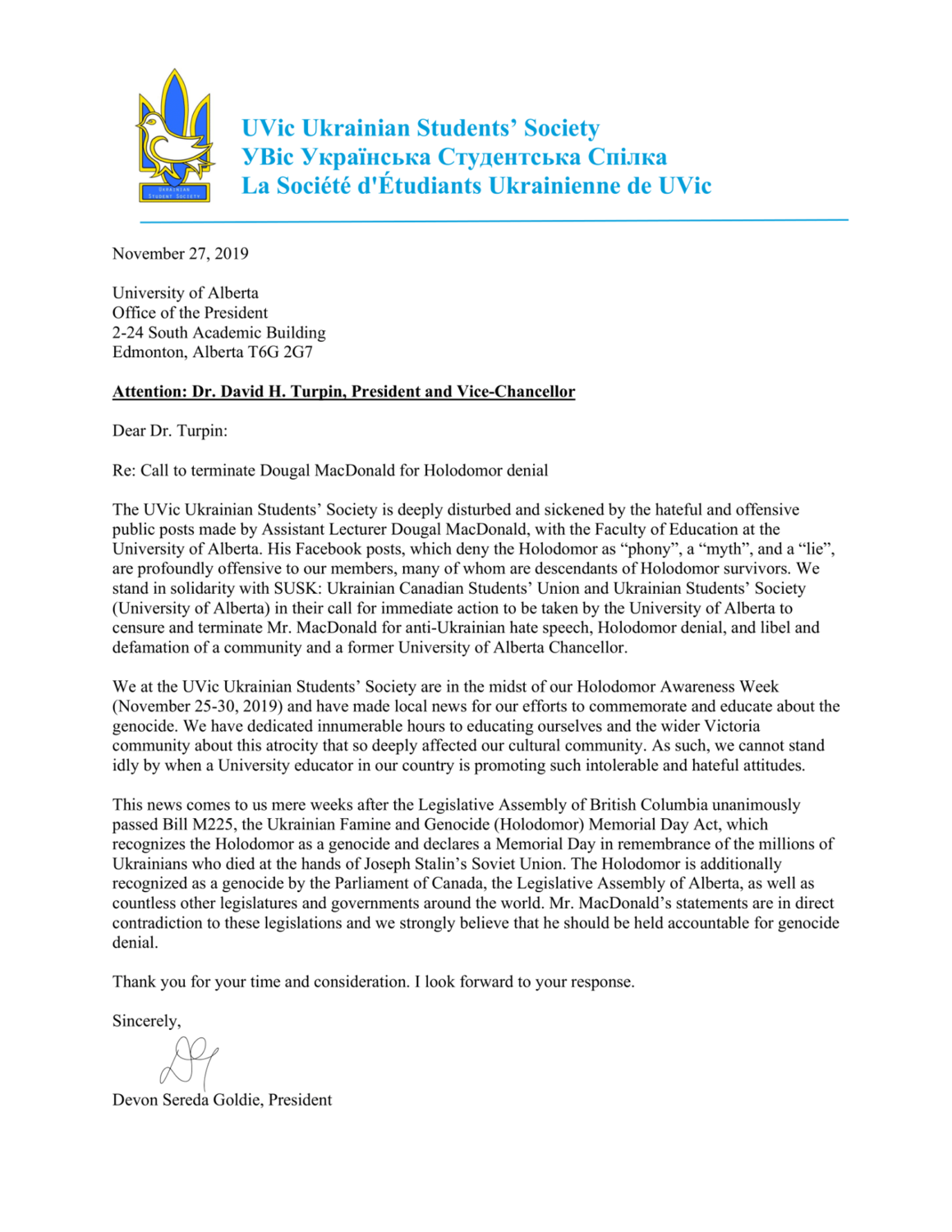 “We at the UVic Ukrainian Students’ Society are in the midst of our Holodomor Awareness Week (November 25-30, 2019) and have made local news for our efforts to commemorate and educate about the genocide,” reads the letter written by society president Devon Goldie.