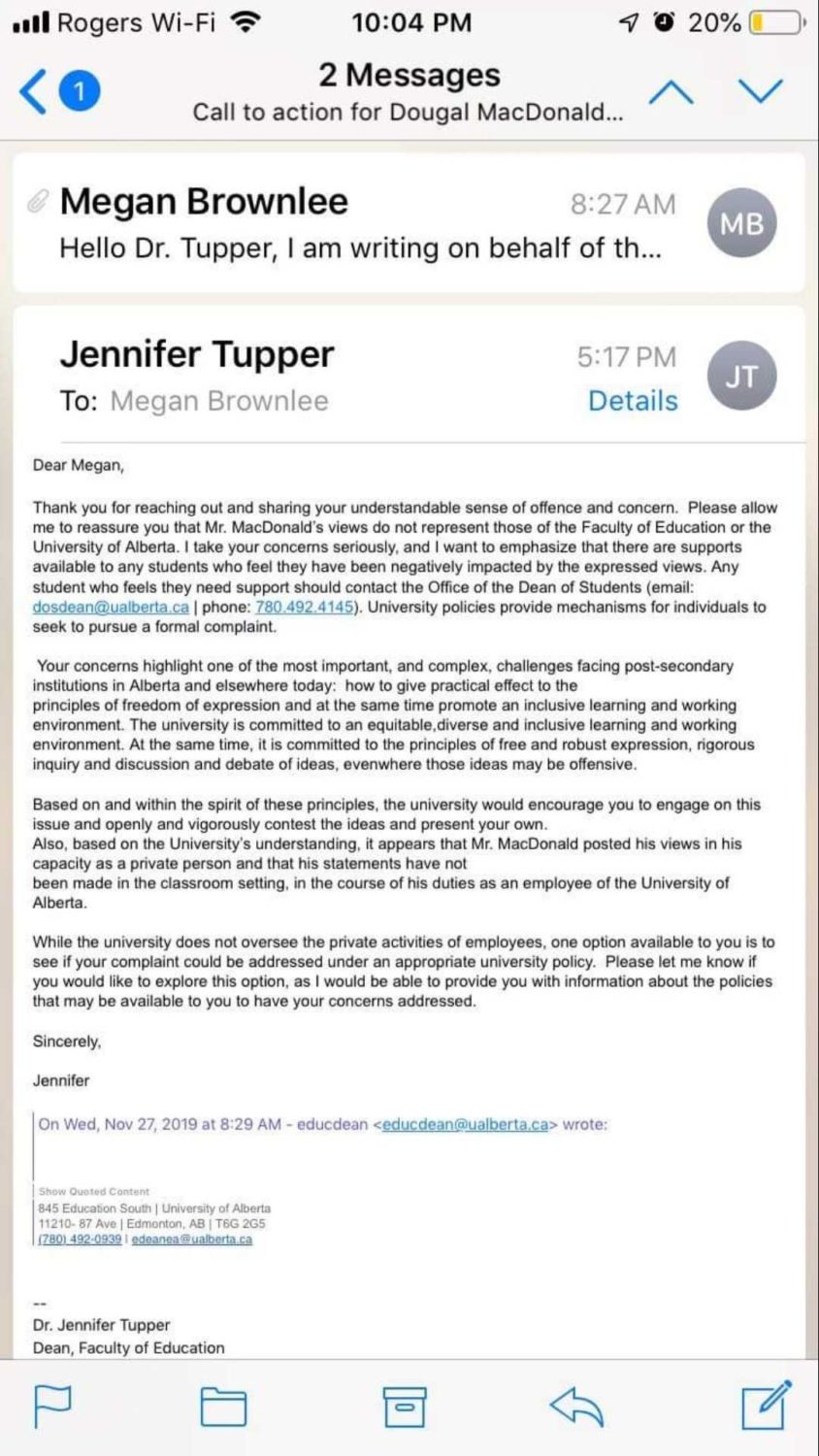 “…Also, based on the University’s understanding, it appears that Mr. MacDonald posted his views in his capacity as a private person and that his statements have not been made in a classroom setting, in the course of his duties as an employee of the University of Alberta.”
