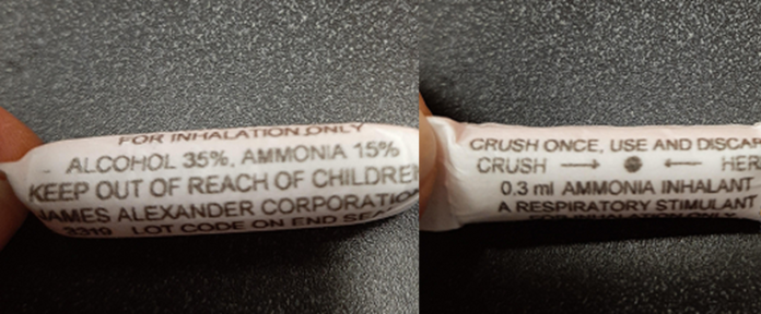 Police say they were this evening called around 6:30 p.m. to the 900-block of Arm Street in Esquimalt after a parent located an ammonia inhalant, commonly referred to as “smelling salts”, in their child’s Halloween candy.