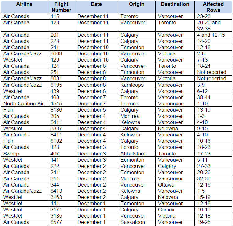 The first flight, aircraft 8081, number landed in Victoria from Vancouver on December 8. The rows of people who may have been exposed have not been reported to the BCCDC.
