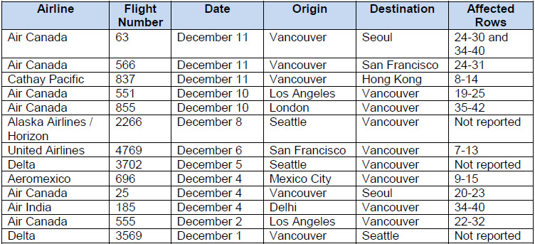 The BCCDC says that passengers seated in affected rows should consider themselves to be at higher risk of exposure due to proximity to the positive case.