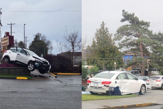 As a result of the crash, one vehicle, a white SUV, was sent towards the grocery store parking lot causing the vehicle to drive over a raised landscaping wall, before coming to a stop.