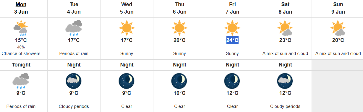 The remainder of the week promises clear skies and no signs of clouds, with highs climbing to 20°C on Thursday, 24°C on Friday, and Saturday hitting around 23°C. Sunday will see a slight dip in temperature, but sunshine remains in the forecast.