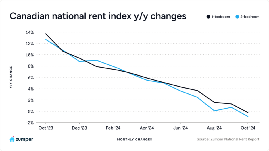 For the first time since its launch in July 2022, the Zumper Canadian National Rent Index reports an annual decline in national rent prices.