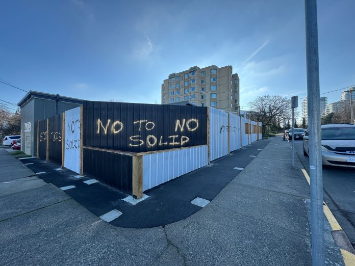 However, the site has been subject to crime, where the outdoor ‘accessory building’ structure has been recently defaced with graffiti reading, “NO TO SOLID,” “STOP THIS” and “NOT WELCOME.”
