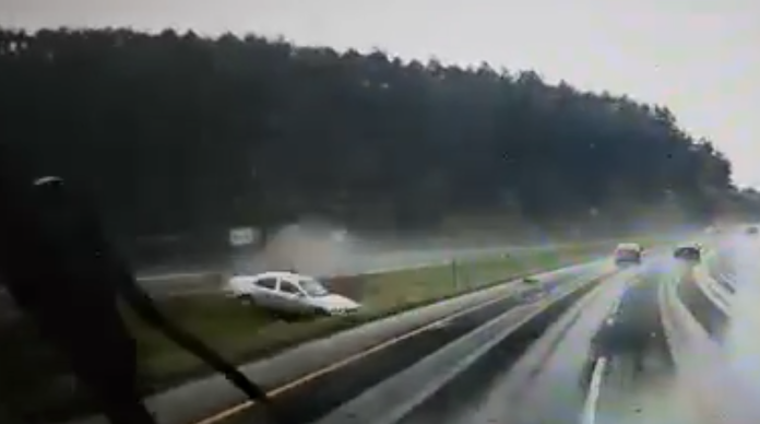 At approximately 4:05 p.m., a vehicle travelling southbound on the highway near the 6 Mile Road exit appeared to lose control or hydroplane, causing it to veer across the median into oncoming northbound traffic.