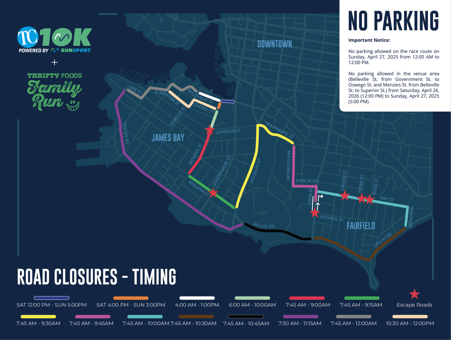 This year’s TC10K features a brand new route, passing through James Bay, Cook Street Village, and Fairfield before heading back along Dallas Road. It’ll no longer weave through the downtown core, but you’ll still want to watch out for major closures in the area.
