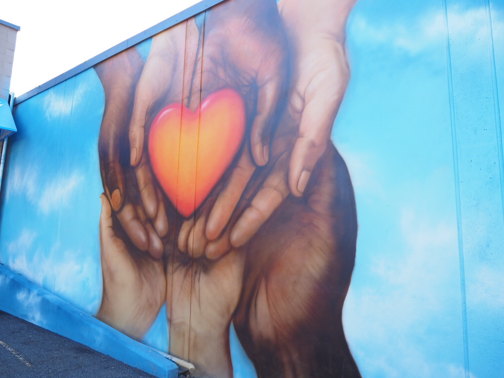 He ended up painting several people’s hands all holding a heart which is yellow in the centre to represent the Mustard Seed, but gradients out to a red hue on the heart’s border to show the range of love and support the organization provides.