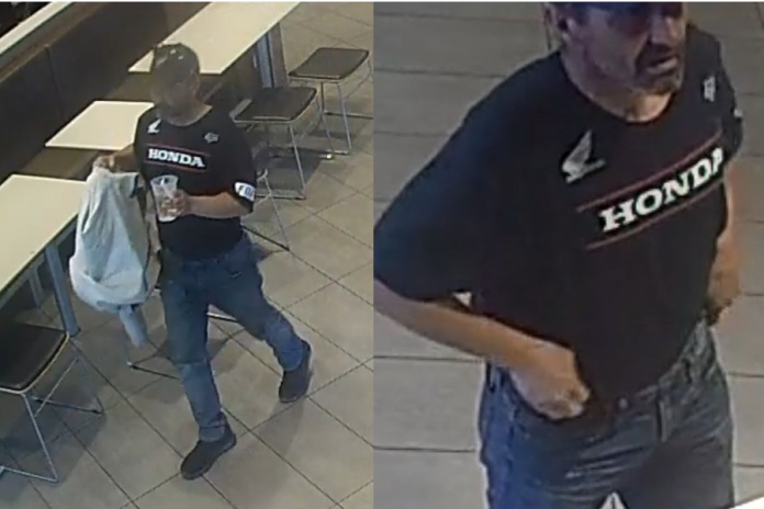 The suspect remains at large but is clearly seen in the attached surveillance footage. He is described as a Caucasian man, approximately 40 to 45 years old, with a medium build and a goatee. He was wearing a black “HONDA” t-shirt, a dark baseball cap, and blue jeans.