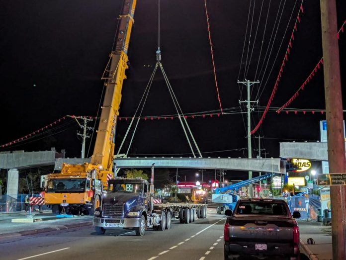 Built off-site by Surespan, crews are now working overnight to crane gigantic steel spans in place over Sooke Road.