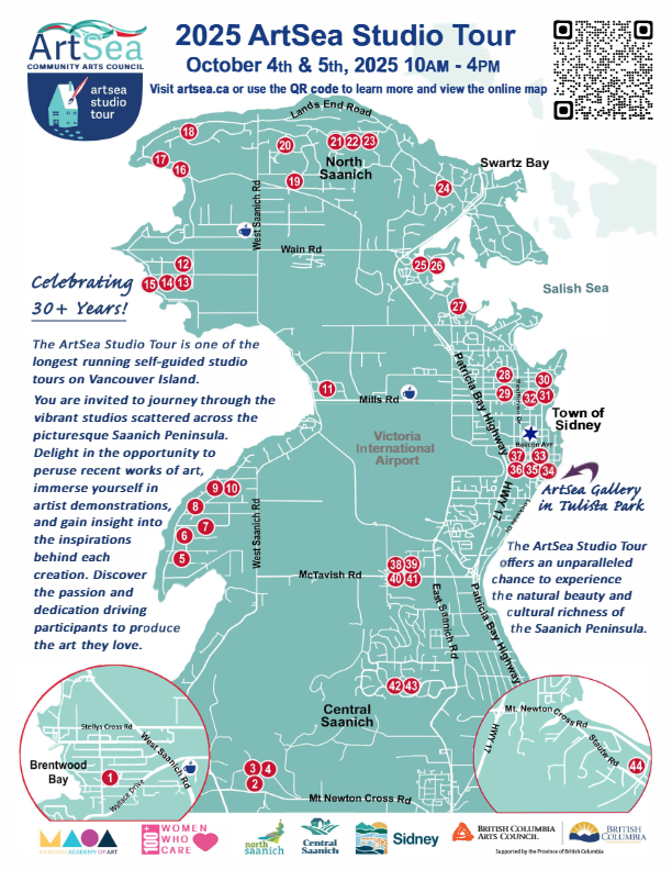 Printed brochures with maps and information are available at the ArtSea Gallery in Tulista Park, the Sidney Information Centre and other key locations across Greater Victoria and the Peninsula.