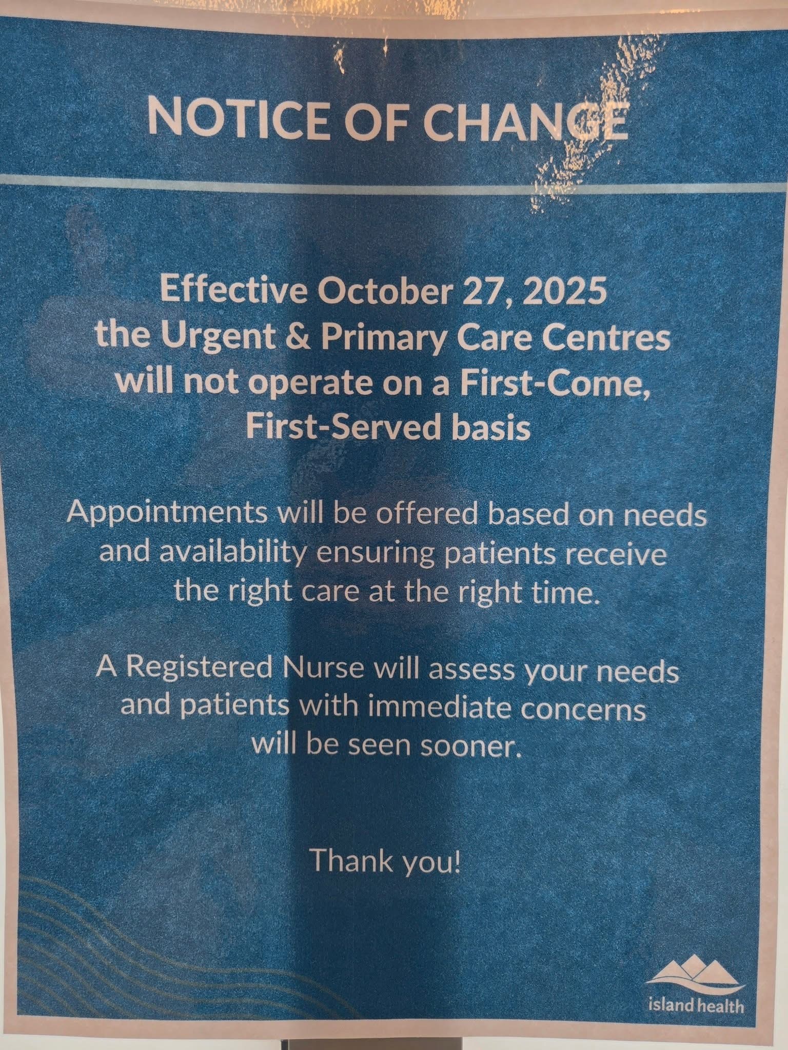 According to Island Health, UPCCs in the south island region will now be triaging patients based on their needs, where before, they would be seen on a first-come first-served basis.