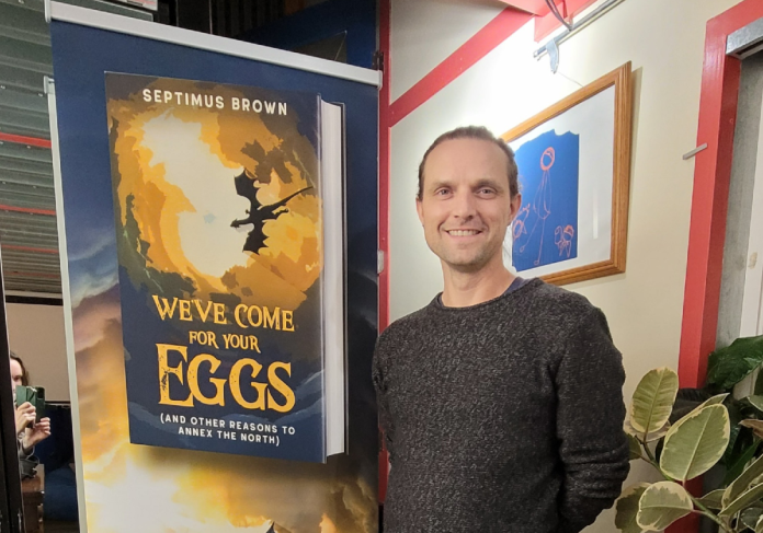 Local Victoria author Septimus Brown’s latest offering frames the ongoing US-Canada trade as a satirical fantasy quest titled We’ve Come for Your Eggs (And Other Reasons to Annex the North).