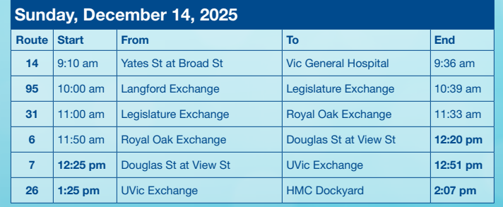 Also on December 6th, the IEOA Truck Light Parade will begin at 5 p.m. at the Breakwater at Ogden Point before travelling through the region toward Colwood. BC Transit will join about 80 commercial vehicles taking part.