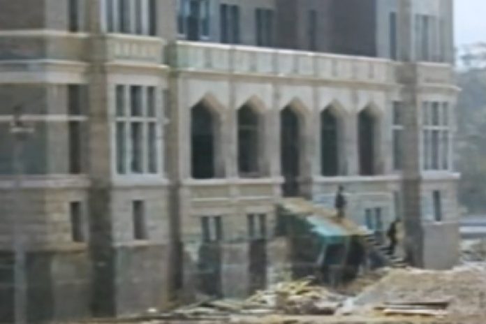 As the camera slowly pans, viewers can see workers, scaffolding, and building materials surrounding the massive structure before the shot turns outward to reveal the harbour on the opposite side.