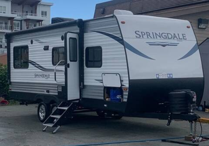 The trailer is described as a white and grey Springdale-brand travel trailer. It was reported stolen on January 14th.
