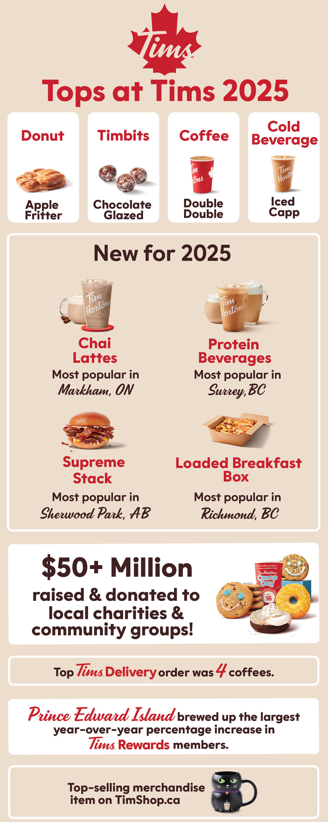 Other trends from 2025 include a large year-over-year increase in Tims Reward members in Prince Edward Island and a delivery order pattern that most often included four coffees.