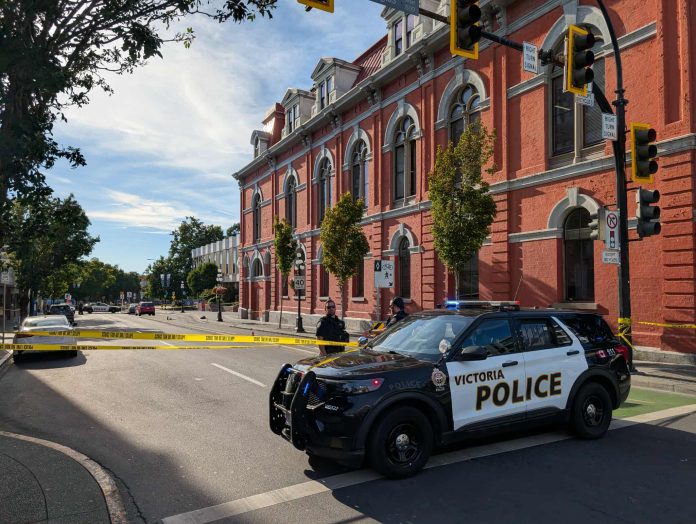On August 1st, 2025, at around 3:48 p.m., VicPD received numerous reports of a man armed with a rifle sitting across Pandora Avenue from Victoria city hall.