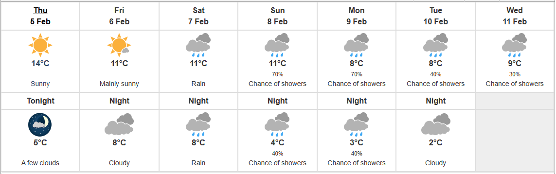 According to Environment Canada, the forecast for Thursday, February 5th calls for sunny skies and a high of 14°C. Overnight, conditions will be clear, becoming partly cloudy before morning with a low of 5°C.