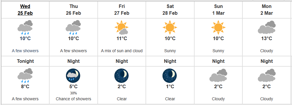 According to Environment Canada, Wednesday, February 25th is expected to start out as sunny in Victoria, with cloudiness gradually increasing throughout the day. Some showers may be expected and the high is predicted to get up to 10°C while the low will be around 8°C.