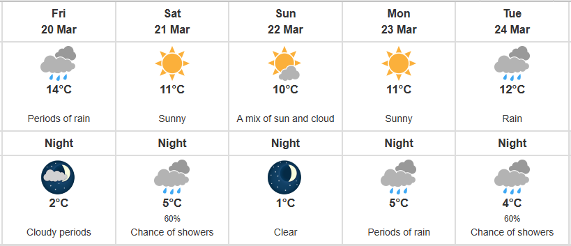 Nanaimo’s forecast is calling for rain on Saturday, with a mix of sun and cloud on Sunday and highs ranging between 9°C and 13°C throughout the week. Port Alberni will be similarly rainy, with average highs around 10°C.