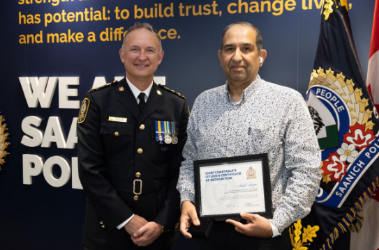 His actions helped save his fare from losing over $12,000. Arya was presented with the Chief Constable’s Citizen’s Certificate of Recognition.