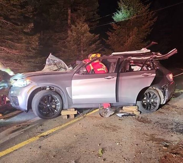 According to police, a grey 2018 BMW X5 slammed into a rock face and flipped, causing significant damage to the vehicle.