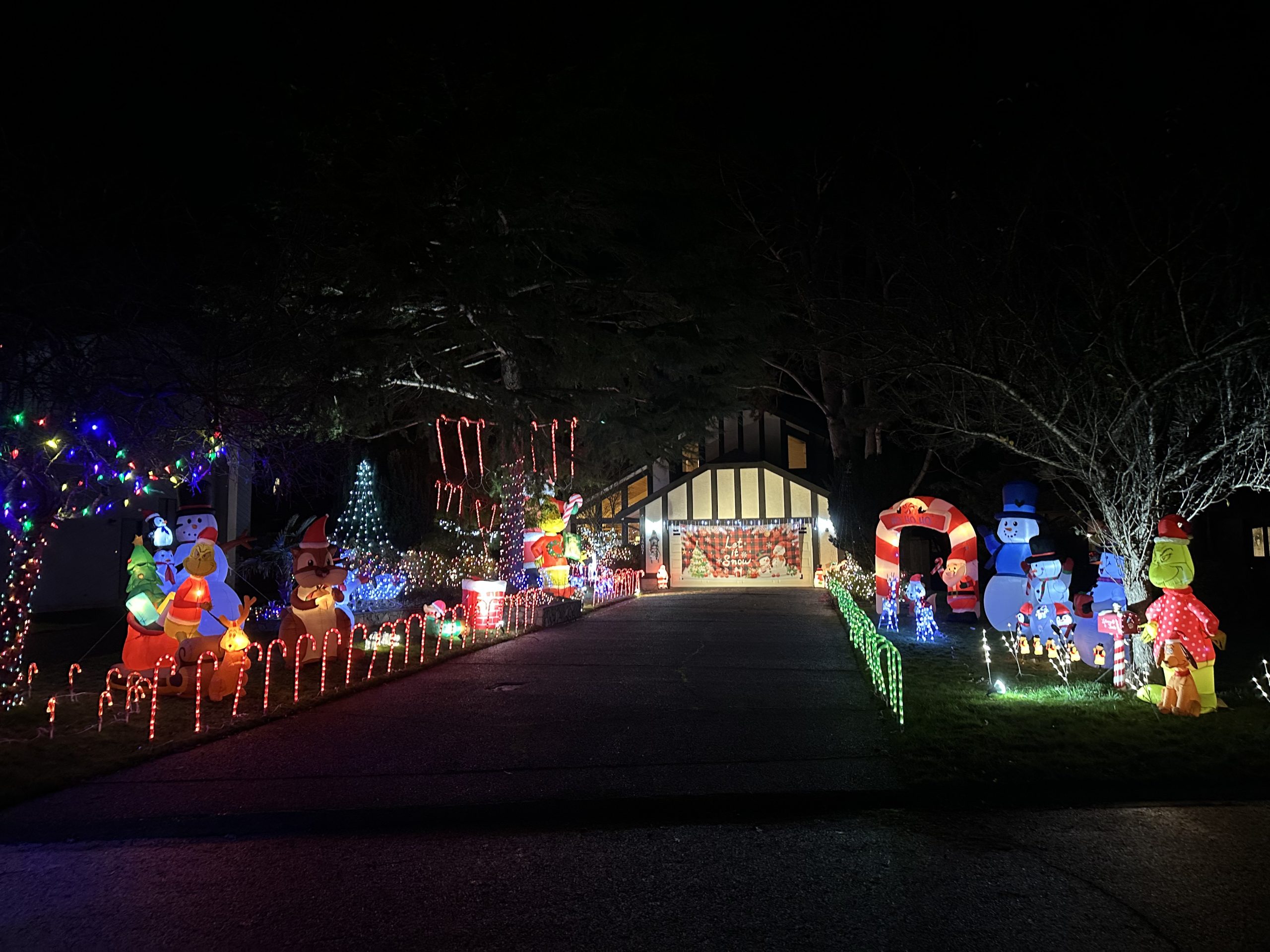 15ft Santa and other inflatables and lights. Plus, over 100 candy canes to line the way.